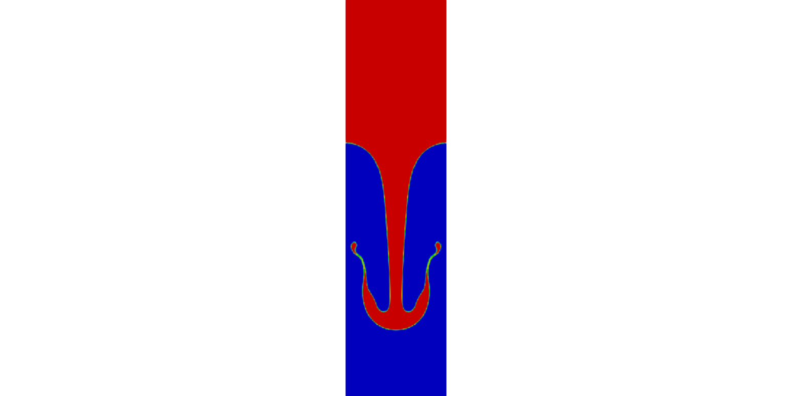 The following animated picture show the time evolution of the phase fraction and velocity fields calculated by interFoam. The results show that the perturbation develops downwards generating the “mushroom” characteristic shape.